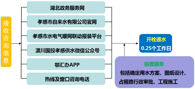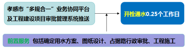 流程說明:供水企業通過孝感市“多規合一”業務協同平臺及工程建設項目審批管理系統推送獲取項目建設信息后主動對接,先行開展確定用水方案、圖紙設計、工程施工等服務,辦理用水工程涉及的占道、掘路、占用綠地、伐移樹木等相關行政審批手續,提前完成外線工程實施,為客戶提供“無感免申請”服務。客戶需要用水時,0.25個工作日內開栓通水。