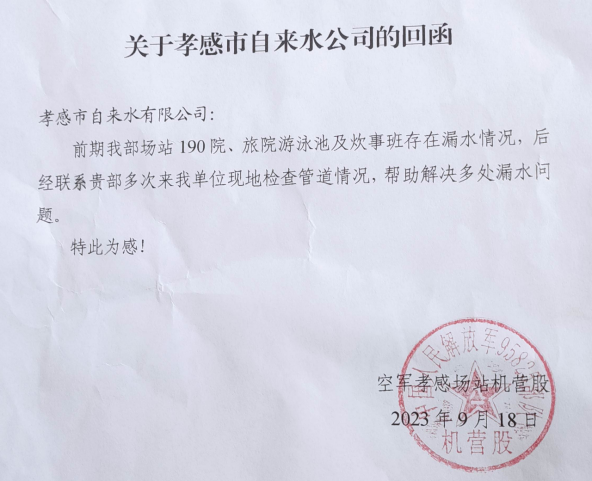 除此之外,再與工作人員的溝通中我們得知,該院內(nèi)新建的一處游泳池一直無法通水,秉持著讓用戶滿意的服務理念,我公司技術(shù)人員馬不停蹄義務幫助其查明原因,恢復正常通水,解決了用戶的各種用水問題。事后,為了感謝我公司高效率高質(zhì)量的為民服務,空軍孝感廠站機營股工作人員特意送來了感謝信。