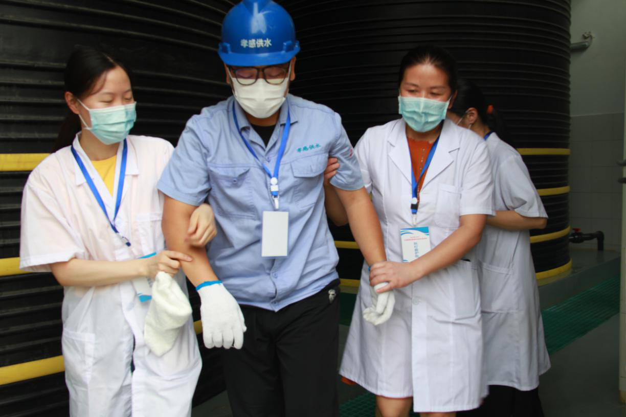 此次演練是以正在使用中的儲(chǔ)液罐的底部破裂,導(dǎo)致次氯酸鈉大量外泄為背景。當(dāng)天上午9:30分,演練正式開始。值班人員在巡視過程中被次氯酸鈉藥劑噴濺至手臂受傷,值班班長(zhǎng)立即報(bào)告總指揮,總指揮下令立刻全面啟動(dòng)次氯酸鈉應(yīng)急處置預(yù)案,通訊聯(lián)絡(luò)組、醫(yī)療救護(hù)組、安全疏散組、現(xiàn)場(chǎng)處置組前往現(xiàn)場(chǎng)開展救援及搶修。