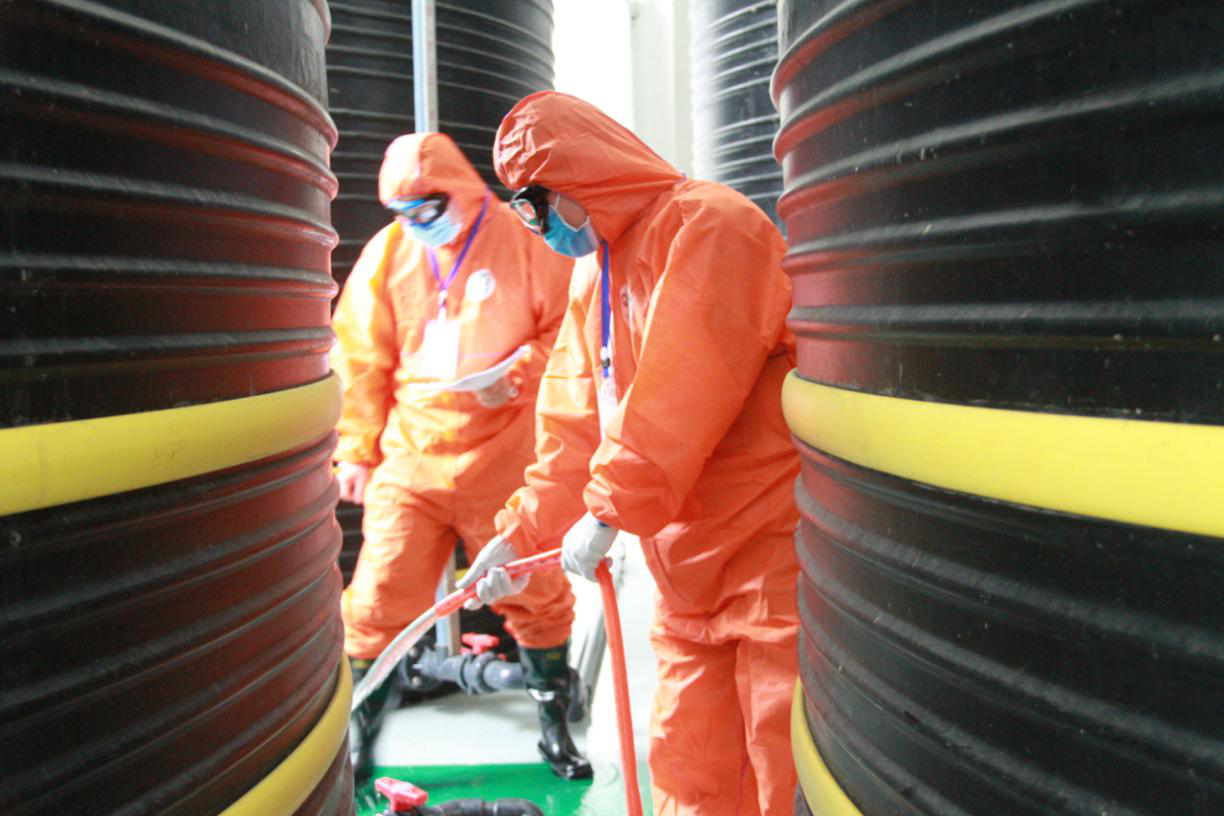 到達(dá)事故發(fā)生現(xiàn)場(chǎng),醫(yī)療救護(hù)組迅速將受傷人員轉(zhuǎn)移至安全區(qū)域,按救護(hù)要求進(jìn)行現(xiàn)場(chǎng)應(yīng)急救護(hù),并同時(shí)撥打120急救電話,將傷者送醫(yī)院救治。隨后現(xiàn)場(chǎng)處置組搶修人員穿戴防護(hù)服進(jìn)入事故現(xiàn)場(chǎng),關(guān)閉相連儲(chǔ)液罐的聯(lián)通閥門并找到漏點(diǎn),用專業(yè)工具進(jìn)行堵漏,在漏點(diǎn)周圍圍堰攔截泄漏的次氯酸鈉,并進(jìn)行稀釋、中和,然后收集處理最后將罐體中的剩余次氯酸鈉溶液轉(zhuǎn)至備用罐中。在確認(rèn)事故現(xiàn)場(chǎng)漏點(diǎn)無(wú)泄漏后匯報(bào)給現(xiàn)場(chǎng)總指揮。演練結(jié)束后,現(xiàn)場(chǎng)指揮進(jìn)行了總結(jié),認(rèn)真分析了演練過程中暴露出的一些問題,為處置預(yù)案的進(jìn)一步完善提供了一手資料。