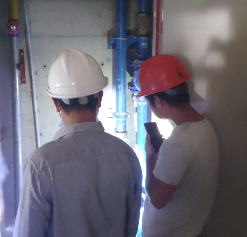驗(yàn)收小組依次巡查了用水閘閥,入戶水表,供水管道,供水井蓋,二供泵房、樓頂水箱等供水設(shè)施,施工方全程參與。本次驗(yàn)收中發(fā)現(xiàn)4處管道井安裝不合格,部分管道油漆標(biāo)識不清晰,入戶水表前后管徑不一致、二供泵房未做防鼠設(shè)施等問題,當(dāng)即要求施工方整改。